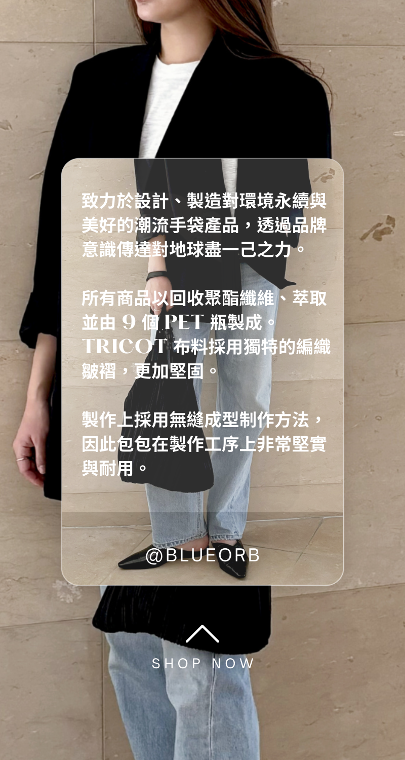 來自韓國的人氣潮流手袋品牌BLUEORB,致力於設計、製造對環境永續與美好的潮流手袋產品,透過品牌意識傳達對地球盡一己之力並採取保護行動,承諾每年將1%營業貢獻並擴大捐贈速度給環境保護組織。所有產品以回收聚酯纖維、萃取並由 9 個 PET 瓶製成。 Tricot 布料採用獨特的編織皺褶,一面平滑,另一面有組織紋路,通常適用於製作沙發或運動服裝,因此布料更加堅固,製作上採用無縫成型制作方法,因此包包在製作工序上非常堅實與耐用。