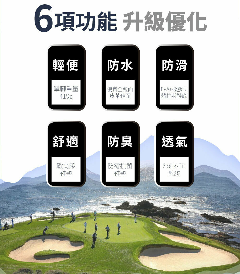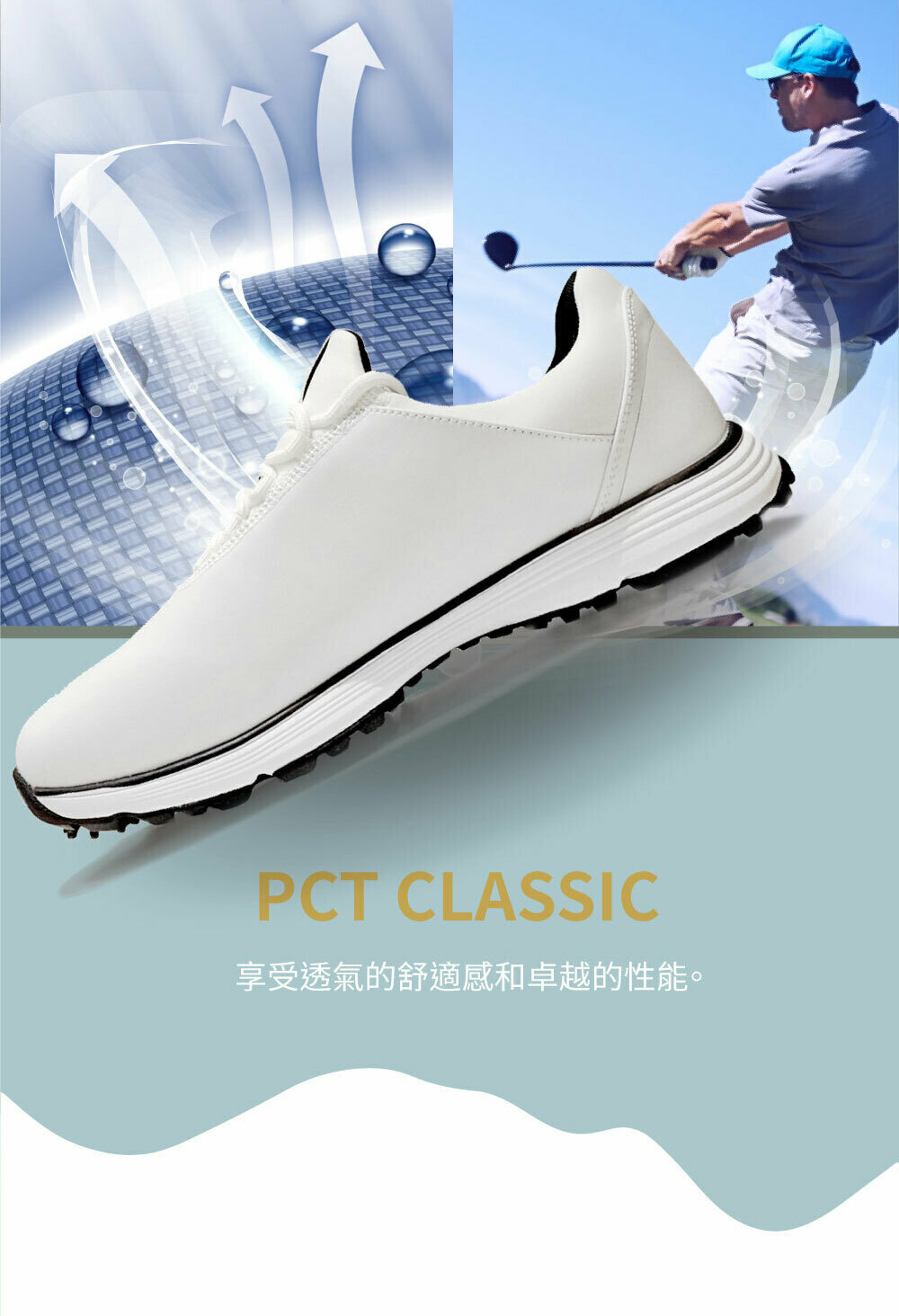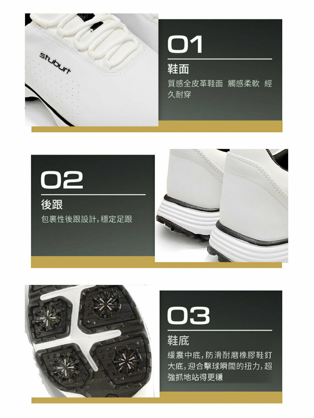 3.防滑球釘鞋款,使用情境為練習場與草地,避免長時間步行水泥地,產生球釘位移與磨損