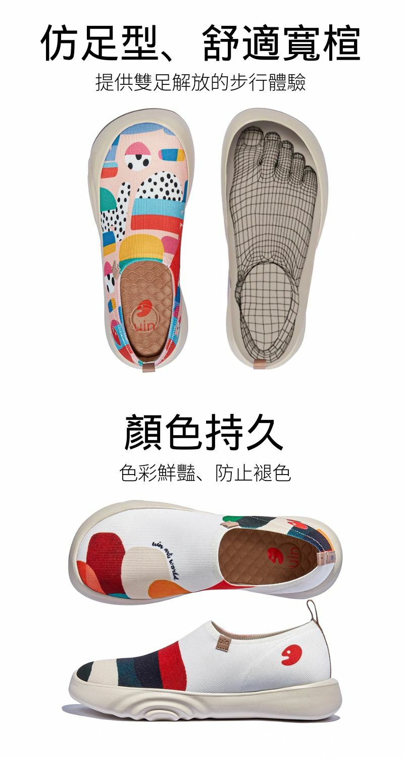 uin西班牙設計師的原創品牌,以旅行之心詮釋健康雙足走訪世界初衷。鞋款設計以趣味彩繪主題為發想主軸,功能特色以輕量抗震、柔軟彈性為雙足健康發展核心,為旅途帶來穿著無負擔的愉快體驗。