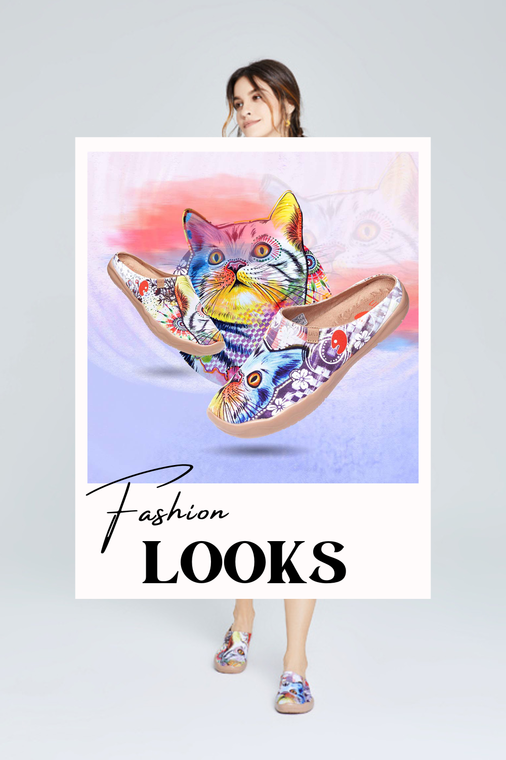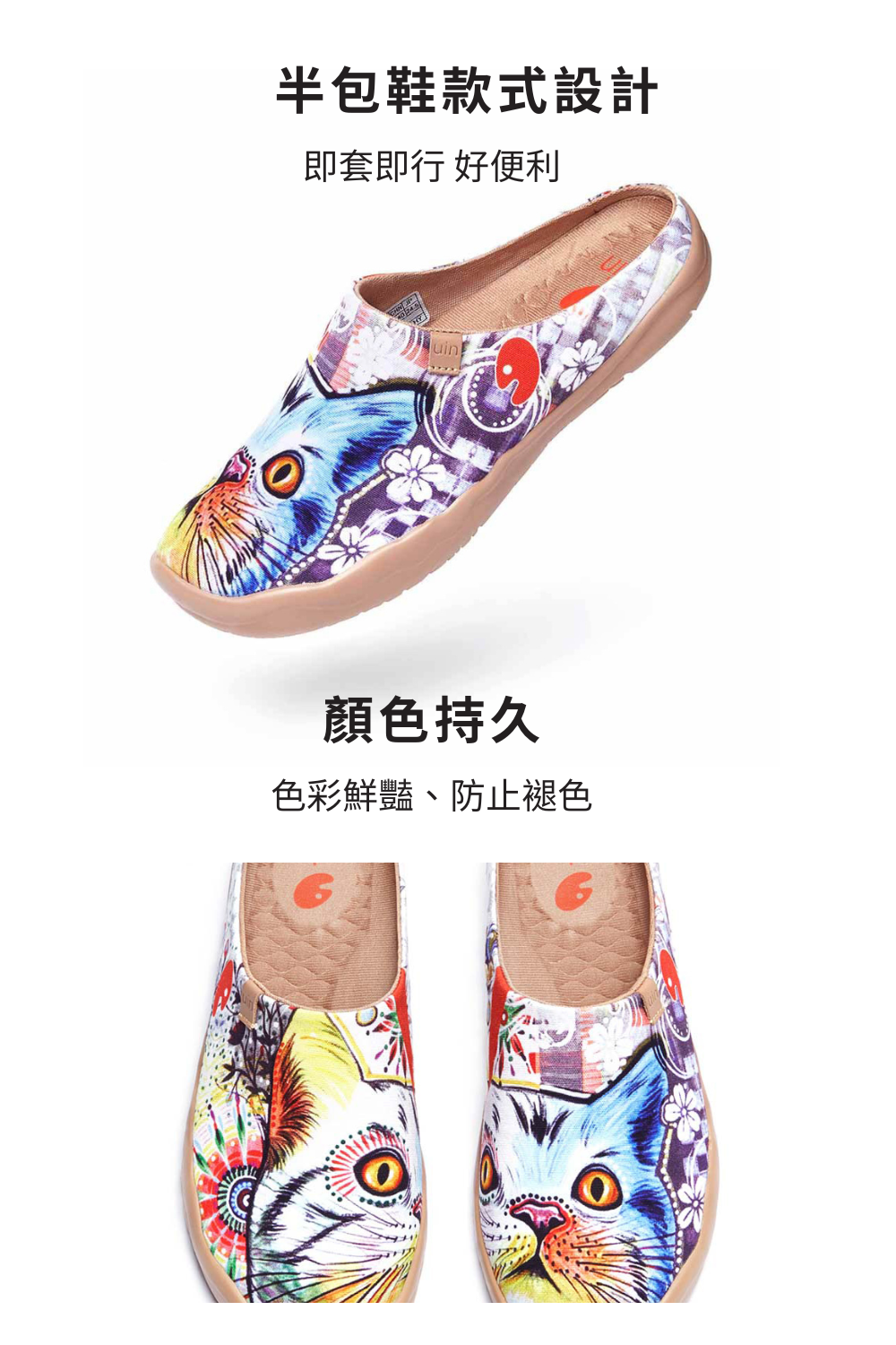 uin|西班牙原創設計 女鞋 半包鞋 半拖鞋 帆布鞋 懶人鞋 彩虹貓咪彩繪休閒鞋W1122486