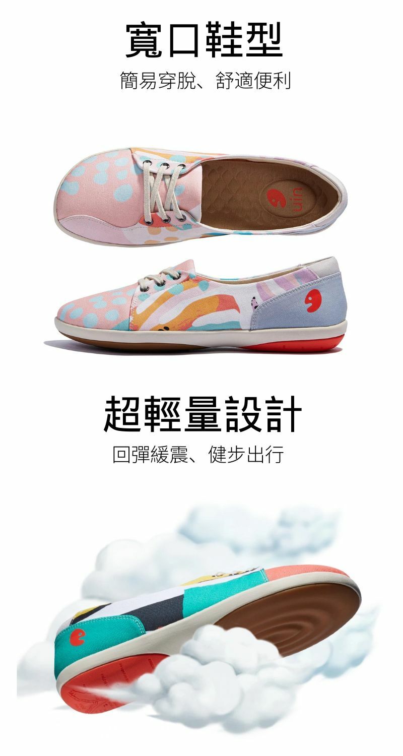 uin西班牙設計師的原創品牌,以旅行之心詮釋健康雙足走訪世界初衷。鞋款設計以趣味彩繪主題為發想主軸,功能特色以輕量抗震、柔軟彈性為雙足健康發展核心,為旅途帶來穿著無負擔的愉快體驗。